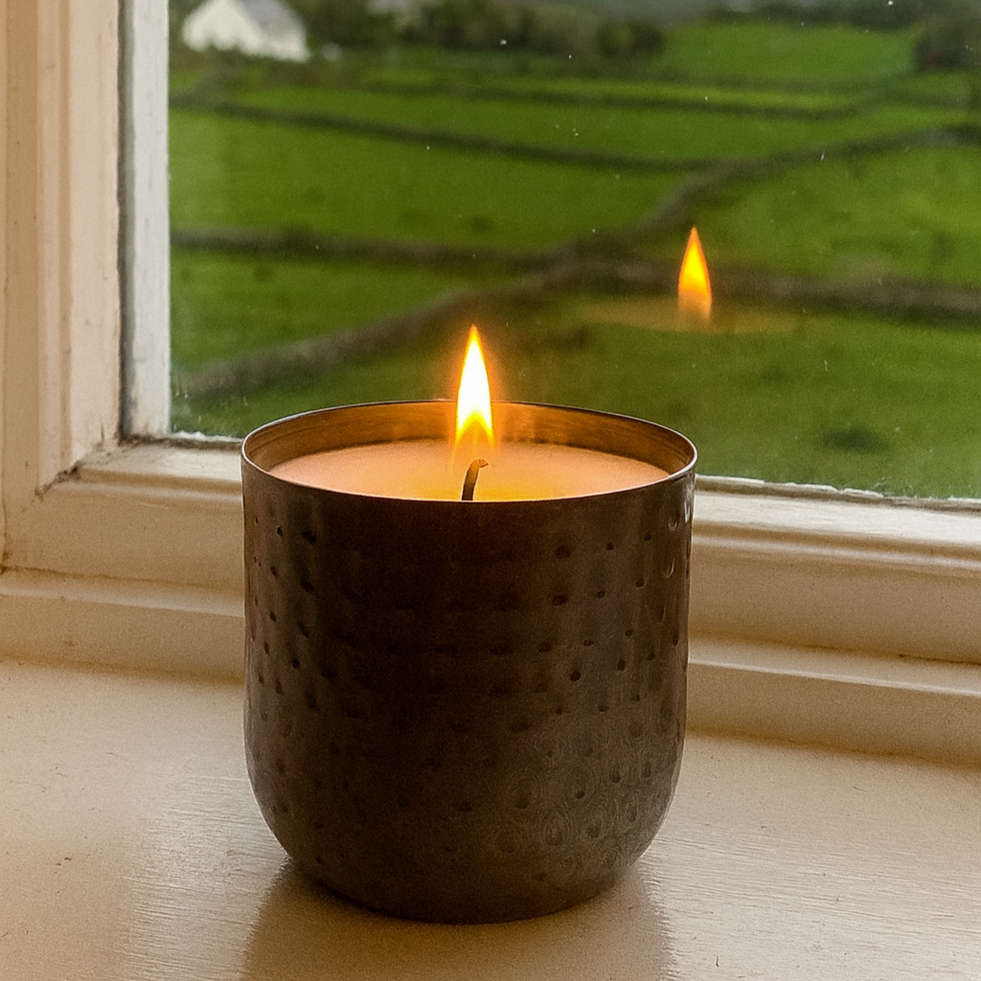Housed in your choice of a hammered black nickel or hammered silver vessel, each piece is poured to order and carefully wrapped — a true statement candle that brings the soul of Ireland into your home.